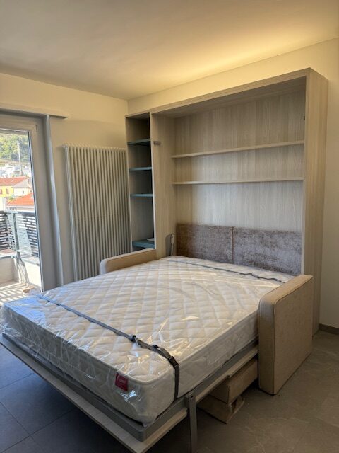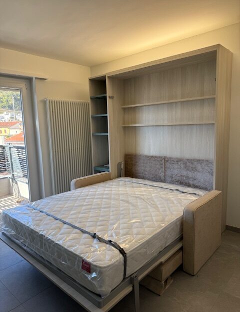 - divano letto con vari ripiani, tavolo con sedie, armadio
