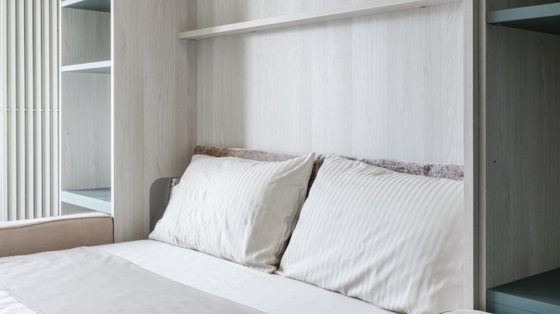 . Schlafsofa mit verschiedenen Ablagen, Tisch mit Stühlen, Schrank